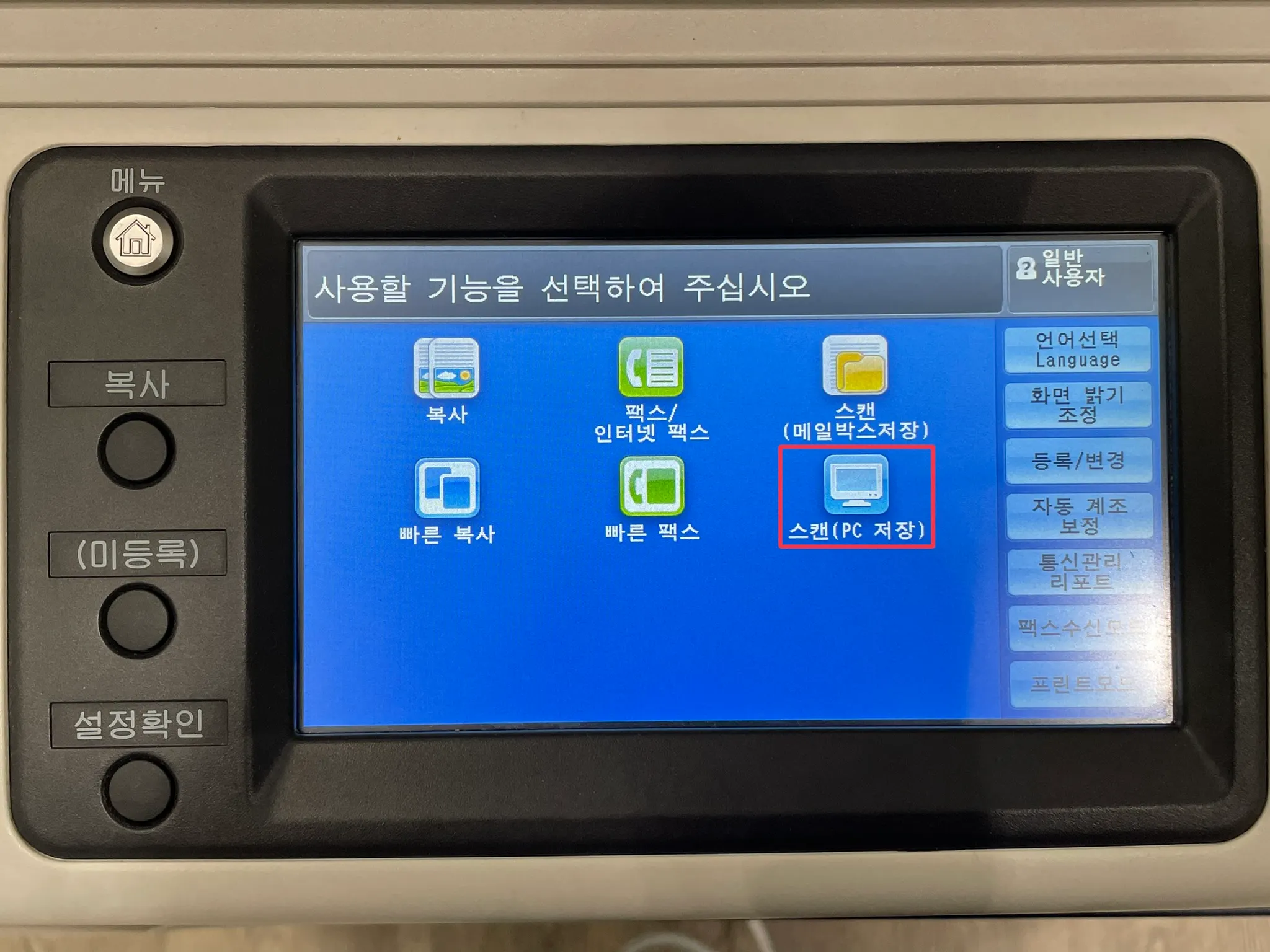 프린트 화면의 우측 하단 "스캔 (PC 저장)"을 눌러주세요