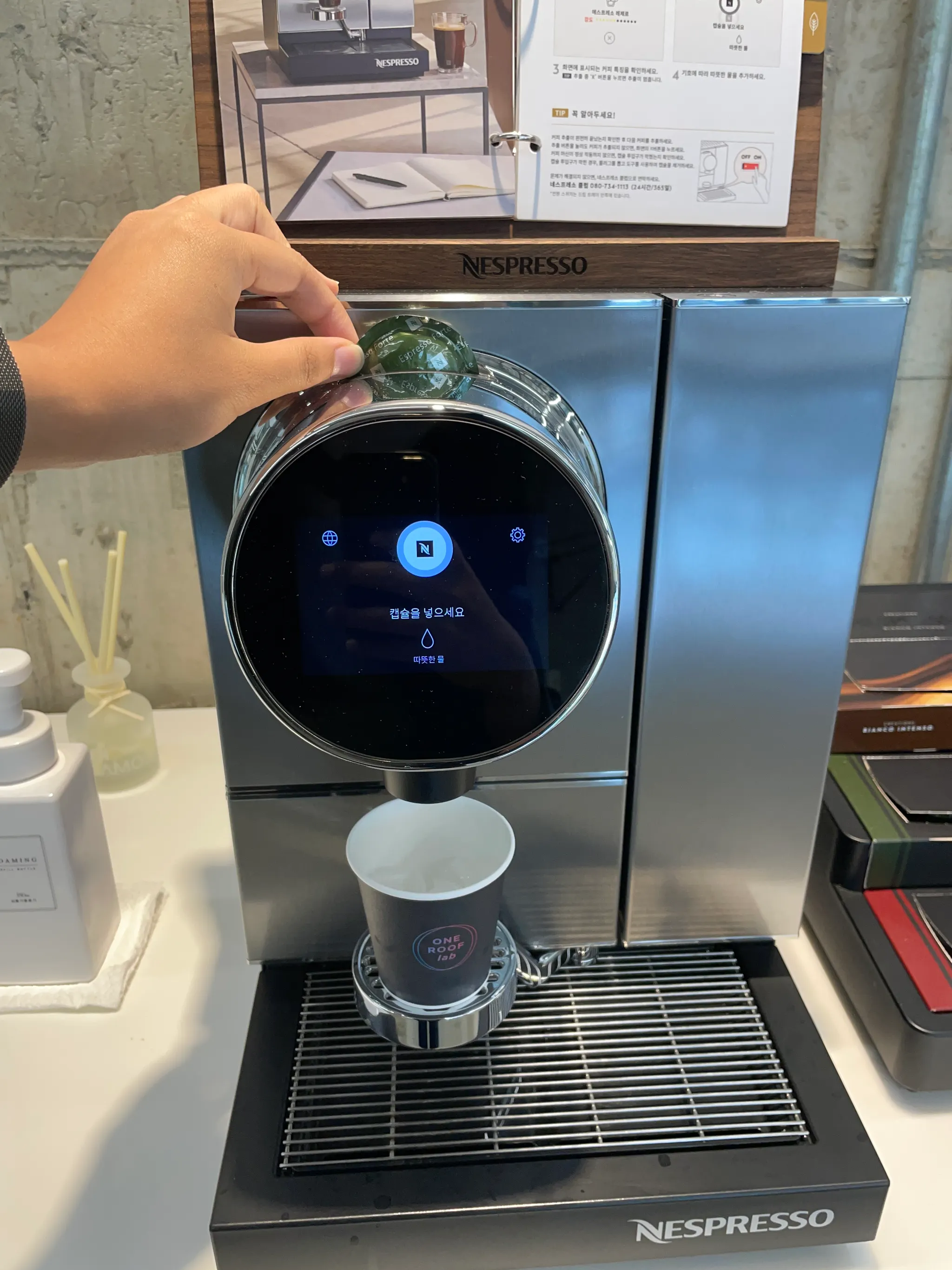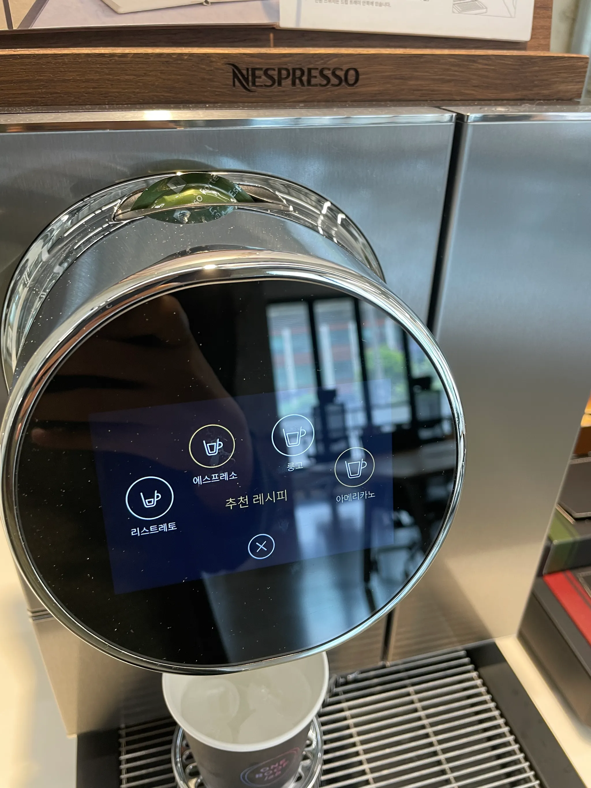 ** 잠깐! 화면에 '캡슐을 넣으세요'라는 문구가 보이지 않는다면 먼저 화면을 터치해주세요. 예열과 클리닝이 완료되면 해당 문구가 보일거에요.