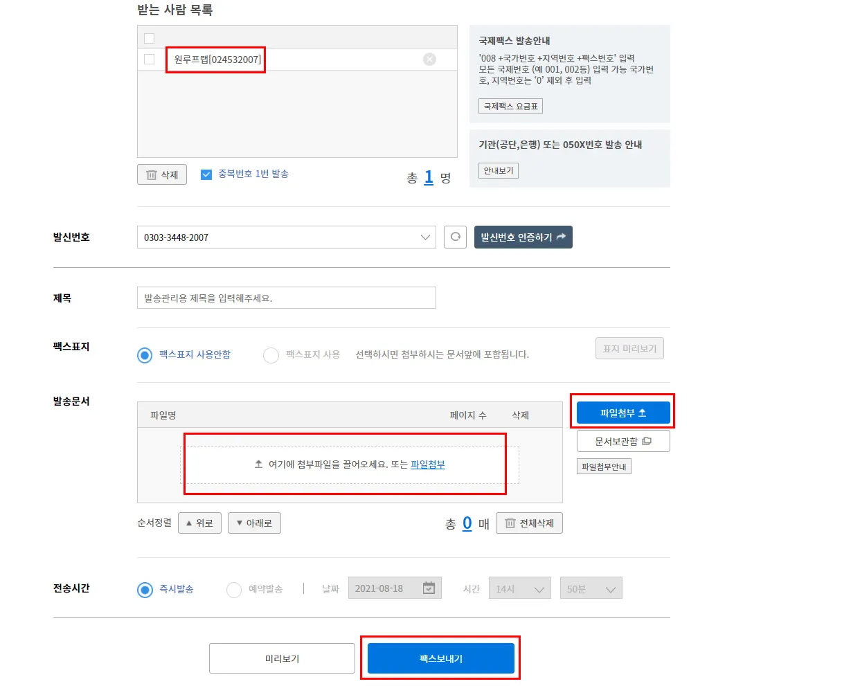 스크롤을 내려 받을사람 목록을 확인하신 뒤 "파일첨부" 후 "팩스보내기" 버튼을 클릭해 주세요