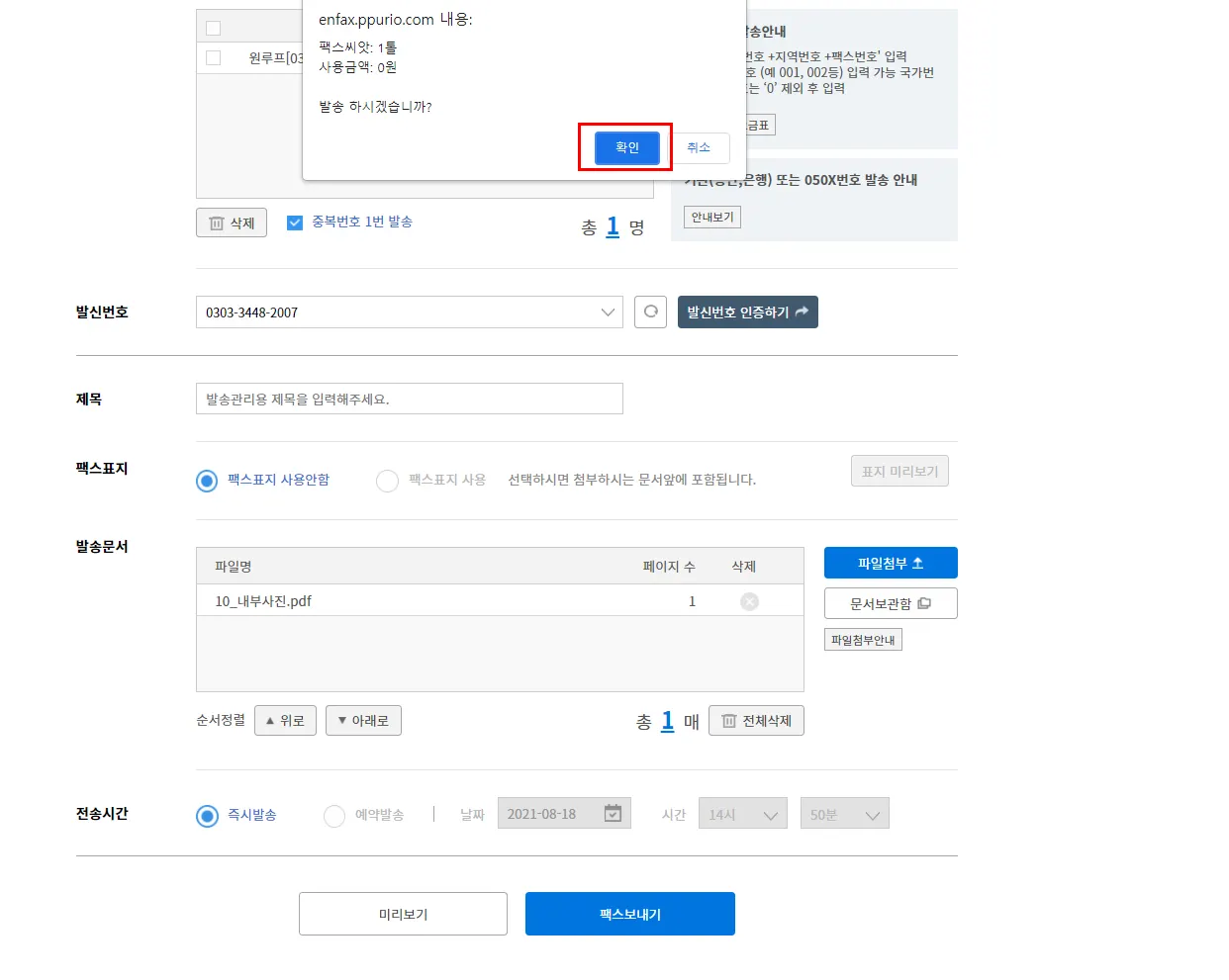 발송팝업에서 "확인" 버튼을 눌러주세요. 원루프랩 팩스번호 0303-3448-2007로 팩스가 전송됩니다.