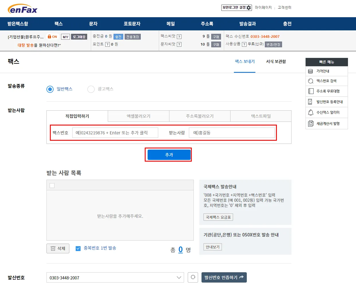 보내실 곳의 팩스번호 및 받는사람을 입력한 후 "추가" 버튼을 클릭합니다