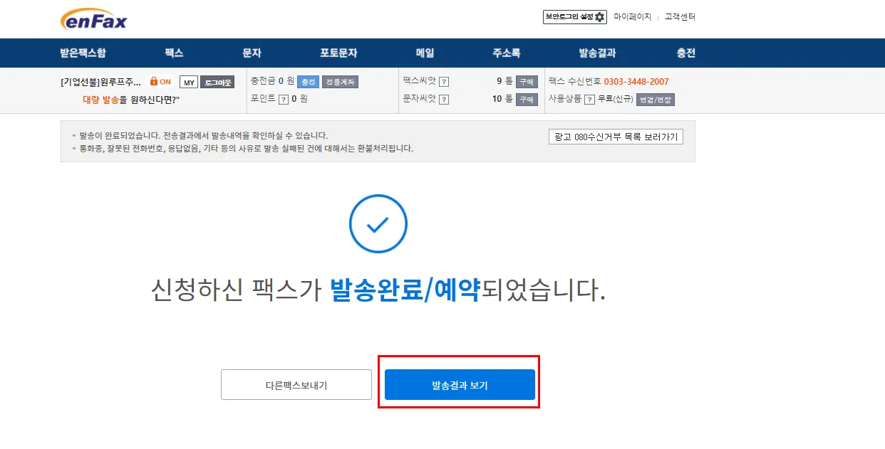발송완료 및 예약창이 뜨게 되고 "발송결과 보기"를 눌러 이상없이 전송되었는지 확인합니다
