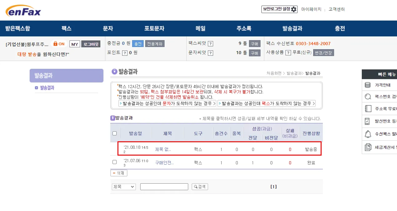 로그인한 화면에서 "팩스"메뉴를 클릭합니다